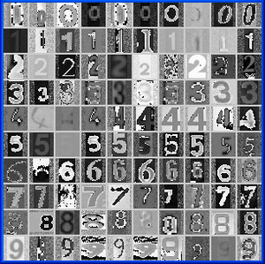 The character recognition datasets are in the simple MNist format, at the same size as the original MNist dataset (28x28). Each pixel is represented as a grey-level in the range 0 (black) to 255 (white). A random selection of 10 digits from each class is shown in the image. All the segmentation and labelling was performed while observing the full size colour images (i.e. including the surrounding context).